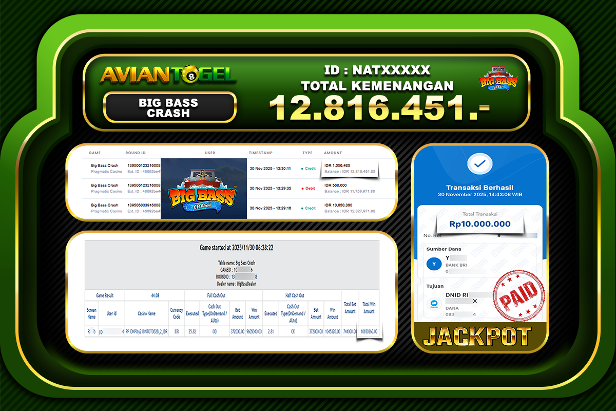 BUKTI PEMBAYARAN SLOT AVIANTOGEL Rp.12,816,451,- GAME : SLOT BIG BASS CRASH
