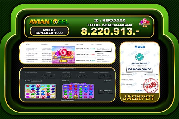 BUKTI PEMBAYARAN SLOT AVIANTOGEL Rp.8,220,913,- GAME : SLOT SWEET BONANZA 1000