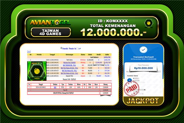 BUKTI PEMBAYARAN AVIANTOGEL Rp.12,000,000,- GAME : TOGEL TAIWAN 4D GAMES