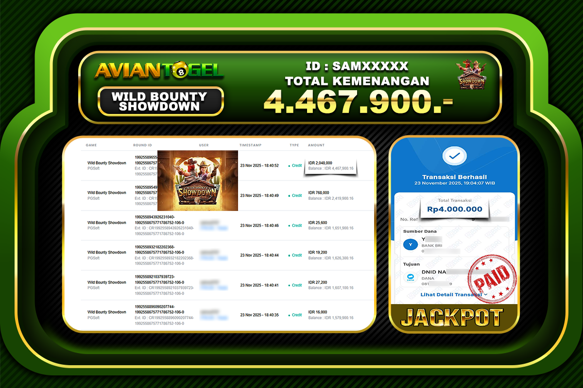 BUKTI PEMBAYARAN SLOT AVIANTOGEL Rp.4,467,900,- GAME : SLOT WILD BOUNTY SHOWDOWN