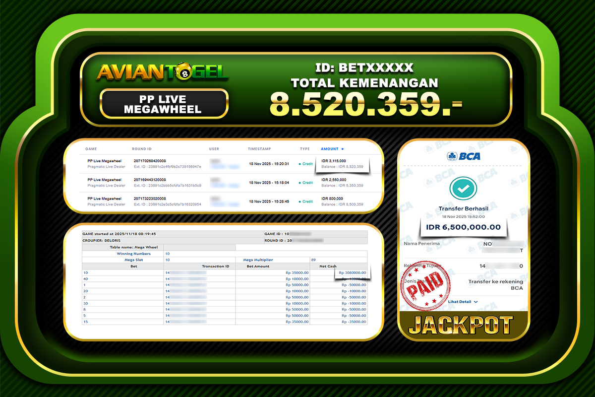 BUKTI PEMBAYARAN SLOT AVIANTOGEL Rp.8,520,359,- GAME : SLOT PP LIVE MEGAWHEEL