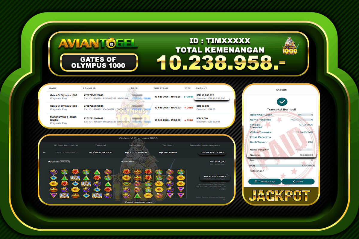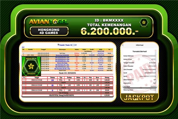 Beberapa situs togel online hanya menjanjikan tanpa ada bukti yang jelas, tapi di AVIANTOGEL semua pasti terbukti dan jelas, BUKTI JACKPOT TOTO TOGEL ONLINE, SLOT ONLINE, LIVE CASINO secara nyata. Melalui kemenangan member setiap hari nya, jackpot besar togel online 2D–3D–4D maupun jackpot besar slot gacor, hingga bukti transaksi kemenangan yang benar-benar masuk ke saldo member.