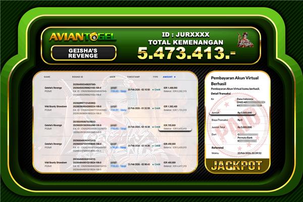 BUKTI PEMBAYARAN SLOT AVIANTOGEL Rp.5,473,413,- GAME : SLOT GEISHA'S REVENGE