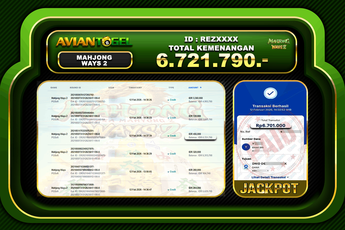 BUKTI PEMBAYARAN SLOT AVIANTOGEL Rp.6,721,790,- GAME : SLOT MAHJONG WAYS 2