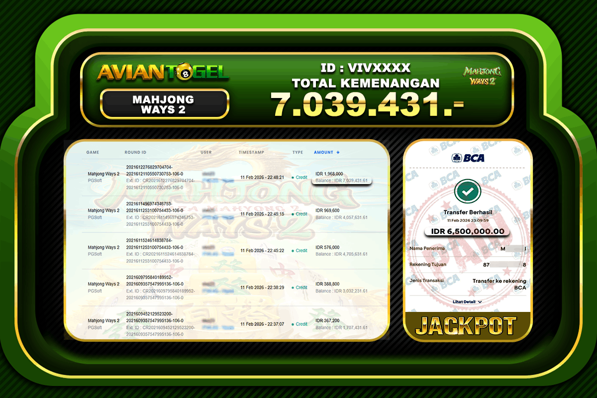 BUKTI PEMBAYARAN SLOT AVIANTOGEL Rp.7,039,431,- GAME : SLOT MAHJONG WAYS 2